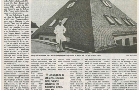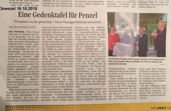 Dewezet Artikel über die Gedenktafel in Bad Pyrmont. An ihrem ehemaligen Bad Pyrmonter Wohnhaus wurde nun anlässlich des Jubiläums am späten Vormittag des 14. Oktobers eine Gedenktafel im Beisein der Tochter Doris Oswald und der Enkelin Laura Oswald-Jüttner enthüllt, die auf den Gründer der AKUPUNKT-MASSAGE hinweist. Die Ansprache hielt der amtierende Vorsitzende des APM-Therapeutenverbandes, Andreas Mühle. Auch der Bürgermeister der Stadt Bad Pyrmont, Klaus Blome, würdigte Willy Penzel als Pionier in der Physikalischen Medizin. Die Kongressleitung des zeitgleich in Bad Pyrmont tagenden 10. TCM-Forums, an dem die Penzel-Akademie mit Vortrag und Ausstellungsstand beteiligt war, Frau Prof. Liu und Herr Prof. Wang, wohnten der Zeremonie bei.