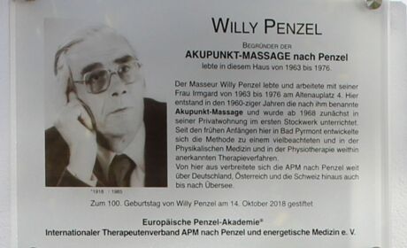 Die 100-Jahrfeier anläßlich des Geburtstags von Willy Penzel wurde als zentrale Gedenkfeier am 14. Oktober 2018 in Heyen und Bad Pyrmont begangen. Willy Penzel wurde in Wattenscheid am 14.10.1918 geboren und verstarb in Heyen am 13. April 1985. Er wäre am 14. Oktober 2018 100 Jahre alt geworden. Bevor Familie Penzel sich in Heyen in eigenen Räumlichkeiten niederließ, wohnte sie viele Jahre in der Kurstadt Bad Pyrmont. Bad Pyrmont liegt eine halbe Autostunde von Heyen entfernt. An ihrem ehemaligen Bad Pyrmonter Wohnhaus wurde nun anlässlich des Jubiläums am späten Vormittag des 14. Oktobers eine Gedenktafel im Beisein des heutigen Bürgermeisters Klaus Blome enthüllt, die auf den Gründer der AKUPUNKT-MASSAGE hinweist.