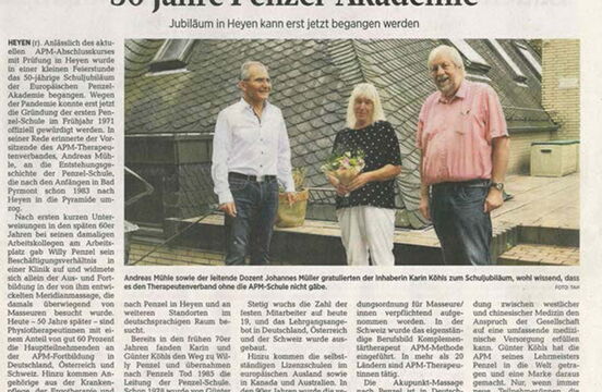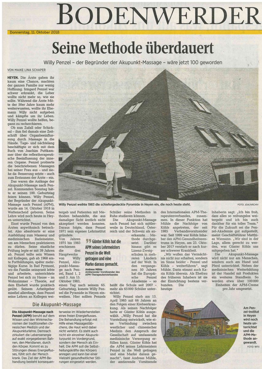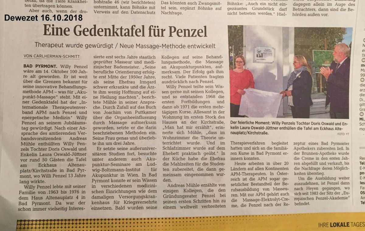 Dewezet Artikel über die Gedenktafel in Bad Pyrmont. An ihrem ehemaligen Bad Pyrmonter Wohnhaus wurde nun anlässlich des Jubiläums am späten Vormittag des 14. Oktobers eine Gedenktafel im Beisein der Tochter Doris Oswald und der Enkelin Laura Oswald-Jüttner enthüllt, die auf den Gründer der AKUPUNKT-MASSAGE hinweist. Die Ansprache hielt der amtierende Vorsitzende des APM-Therapeutenverbandes, Andreas Mühle. Auch der Bürgermeister der Stadt Bad Pyrmont, Klaus Blome, würdigte Willy Penzel als Pionier in der Physikalischen Medizin. Die Kongressleitung des zeitgleich in Bad Pyrmont tagenden 10. TCM-Forums, an dem die Penzel-Akademie mit Vortrag und Ausstellungsstand beteiligt war, Frau Prof. Liu und Herr Prof. Wang, wohnten der Zeremonie bei.