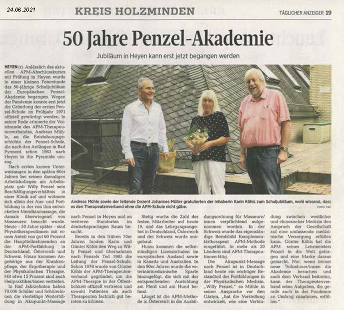 Von 1971 bis 2021 Im Rahmen einer kleinen Feierstunde wurde der Gründung der APM-Schule durch Willy Penzel im Frühjahr 1971 -Corona bedingt- erst am 21. Juni 2021 gedacht. Hierzu waren die gerade anwesenden Kursteilnehmer/innen des D-Kurses herzlich eingeladen. Mit einem sommerlichen Cocktail und bei Kaffee und Kuchen gratulierten der Chefdozent Johannes Müller und der Verbandsvorsitzende des APM-Therapeutenverbandes Andreas Mühle der Inhaberin Karin Köhls zum 50. Geburtstag der Europäischen Penzel-Akademie. In seiner Rede ließ Mühle die Entstehungsgeschichte Revue passieren und ordnete die APM-Methode in der heutigen Bildungslandschaft in Deutschland, Österreich und der Schweiz als wichtigen und in einigen Ländern auch anerkannten Bestandteil der Physikalischen Medizin ein. Um den Wert der AKUPUNKT-MASSAGE nach Penzel als Marke und Methode im Gesundheitswesen weiter zu festigen, ist der APM-Berufsverband einer der wichtigsten Partner der Penzel-Akademie. "Fachberatung, Öffentlichkeitsarbeit und Fortbildung unterstützen die APM-Therapeutinnen und Therapeuten bei ihrer täglichen Arbeit", so führt Andreas Mühle in seiner Ansprache weiter aus. Die APM-Schule freut sich auf zahlreiche neue und neugierige Interessierte in ihren Kursen. Herzlich Willkommen und auf die nächsten 50 Jahre!